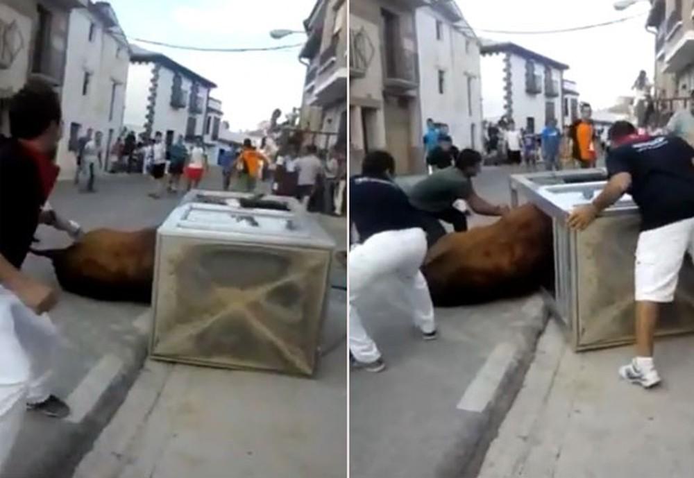 Um touro ficou entalado em uma cabine de telefone durante uma corrida de touros na Espanha. O animal participava da tradicional corrida pelas ruas de Santacara, no norte do país, quando avançou em direção da cabine e ficou preso.