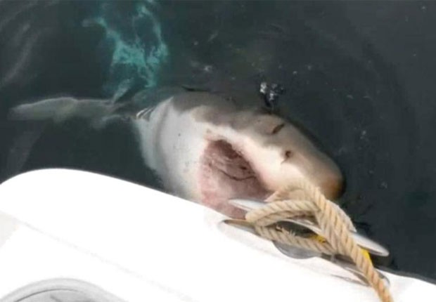 Um grupo de pescadores filmou o exato momento em que um grande tubarão branco arrancou um saco de iscas de seu barco na costa de Cape May, no estado de Nova Jérsei (EUA), no último sábado.