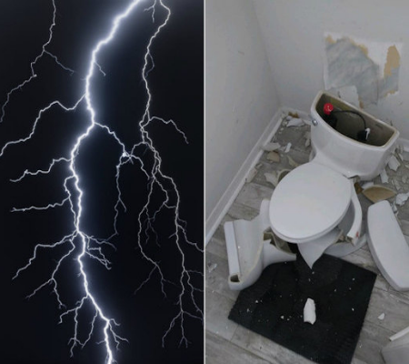 O vaso sanitário de uma casa na Flórida explodiu em centenas de pedaços quando a energia de um raio que atingiu a fossa percorreu a tubulação e chegou até o banheiro da residência, noticia a imprensa local.