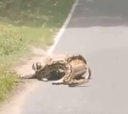 As imagens foram gravadas em uma rodovia e no momento que a enorme cobra está quase vencendo a luta, uma pessoa que passava pelo local usa um galho de árvore tenta impedir que a serpente possa devorar o pequeno animal.