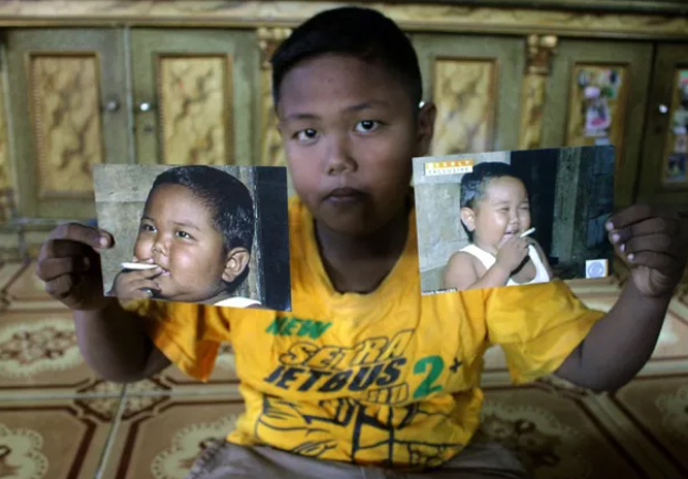 Em 2010, Ardi Rizal, uma bebê nascido na indonésia, escandalizou o mundo ao aparecer em um vídeo fumando um cigarro após o outro. Descobriu-se, então, que o pequeno começou a fumar aos 18 meses quando o pai deu seu primeiro cigarro e aos 2 anos já fumava quase (pasmem!) 40 cigarros por dia. Vale lembrar que na Indonésia, o vício em nicotina atinge pelo menos 1 pessoa da família.