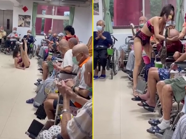 O Vídeo da atração contratada pelo hospital Taipei Veterans, em Taoyuan Branch, em Taiwan, mostra a mulher de sutiã e calcinha fazendo o show para os idosos, a maioria em cadeiras de rodas.