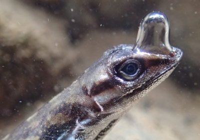 O lagarto cria uma bolha de ar gigante em volta do seu nariz, que possibilita a ele "respirar" mesmo estando submerso. "Não sabemos muito a respeito desse fenômeno ainda, o que o torna bem interessante. É possível que algumas bolsas de ar fiquem presas entre a cabeça e a garganta do lagarto, fazendo com que a entrada e a saída do ar permitam uma 'troca' de ar fresco entre essas bolsas", explicou Swierk.