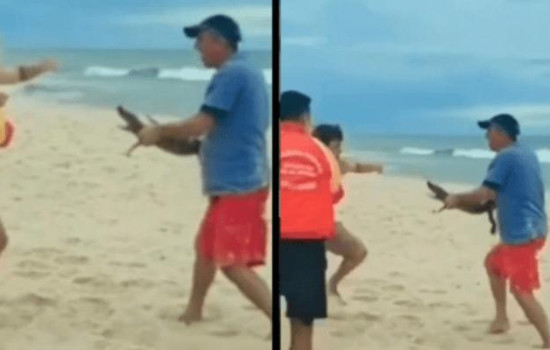 Animal teria sido encontrado na praia por um homem. Ele disse que tentava devolver o bicho a um canal quando foi atacado por banhista