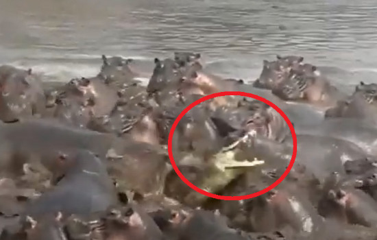 Como é possível conferir no registro, o réptil recebe a investida de vários hipopótamos que se sentiram incomodados com a presença em seu espaço.
