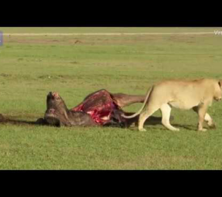 Leões tinham acabado de matar um búfalo, então uma das leoas ficou do lado da carcaça vigiando. Mas, de súbito, uma alcateia de hienas se aproximou da refeição desejada. Pelo visto, todas as hienas estavam com muita fome, pois nem mesmo uma leoa conseguiu fazê-los ir embora.