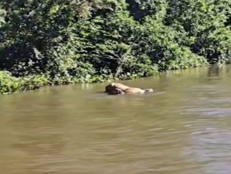 Uma onça-pintada foi flagrada arrastando um boi pela correnteza de um rio entre os municípios de Poconé e Barão de Melgaço, a 104 km e 121 km de Cuiabá, respectivamente. O momento foi registrado pelo fotógrafo e guia de turismo Branco Arruda. No vídeo, a onça-pintada aparece quase submersa, arrastando o boi no rio. Ela leva a presa até a margem e momentos depois se alimenta.