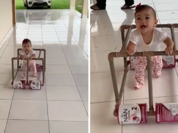 Com apenas alguns canos de PVC e latas de leite, ele conseguiu criar um objeto que normalmente seria muito caro para a família comprar. Apesar da falta de recursos, o pai decidiu fazer tudo o que estivesse em seu poder para fazer sua filha feliz, e sua habilidade e criatividade foram muito elogiadas pelos usuários da plataforma. O aparelho caseiro também parece ser muito firme, permitindo que a menina se desloque com facilidade e segurança pelo chão de sua casa.