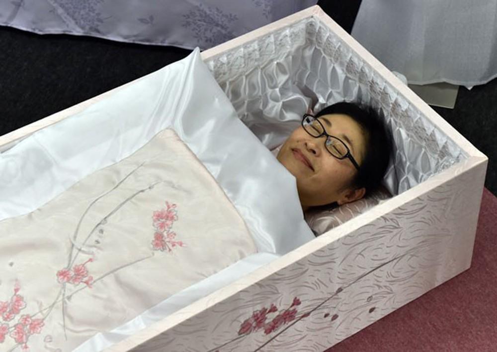 Visitantes chegaram a "testar" caixões durante uma feira para o mercado funerário em Tóquio, no Japão. Cerca de 50 empresas exibiram suas novidades e serviços destinados a funerais. Realizada no domingo (24), a feira recebeu em torno de 5 mil visitantes.