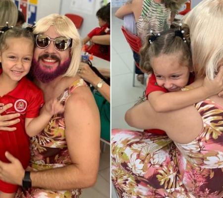 Viúvo se veste de “mãe” para celebrar Dia das Mães na escola da filha