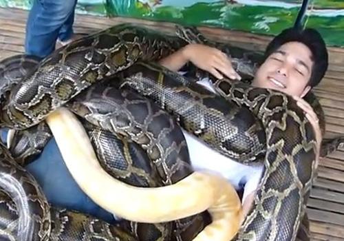 ?Cobras não atacam se não forem machucadas, e usamos pítons porque não são venenosas?, afirmou o homem, que é dono de dois dos animais usados na massagem: ?Michelle?, de 87 kg e ?Walter?, de 76 kg.