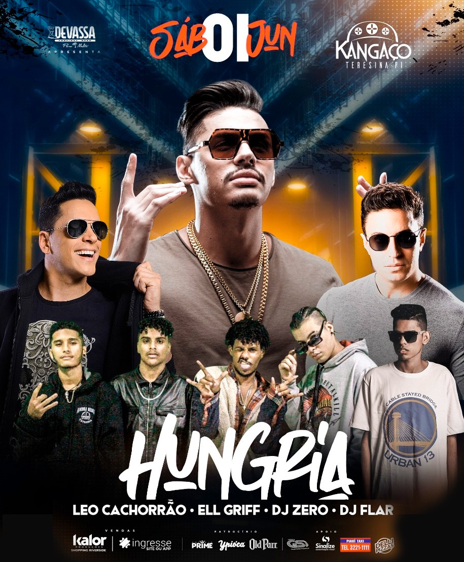 Além de Hungria, a festa contará ainda com shows dos DJs Flar e Zero, Ell Griff e Leo Cachorrão. O show acontece no KANGAÇO SHOWS e inicia às 22h. O evento tem como cerveja oficial a Devassa Puro Malte. O patrocínio é assinado pela Empório Prime, Ypioca e Old Parr. A Delli Pizzas, Gráfica GSJ, Sinalize e Piauí Táxi dão apoio ao show.