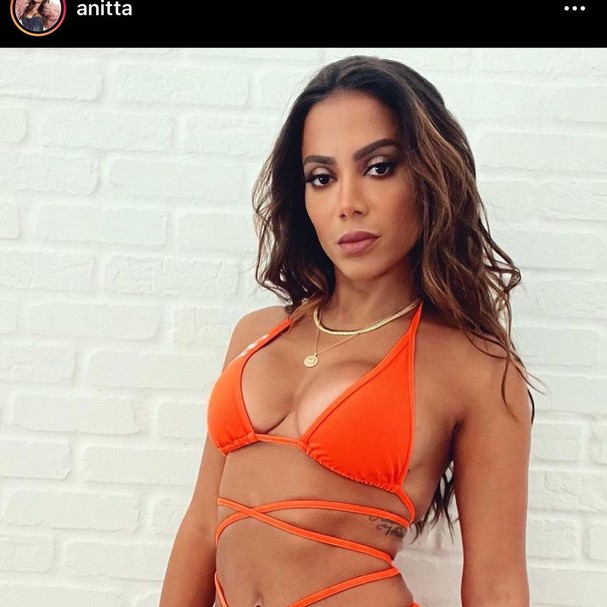 Anitta compartilhou, em suas redes sociais, um clique em que aparece com um maiô cavado e de tiras, na cor laranja.