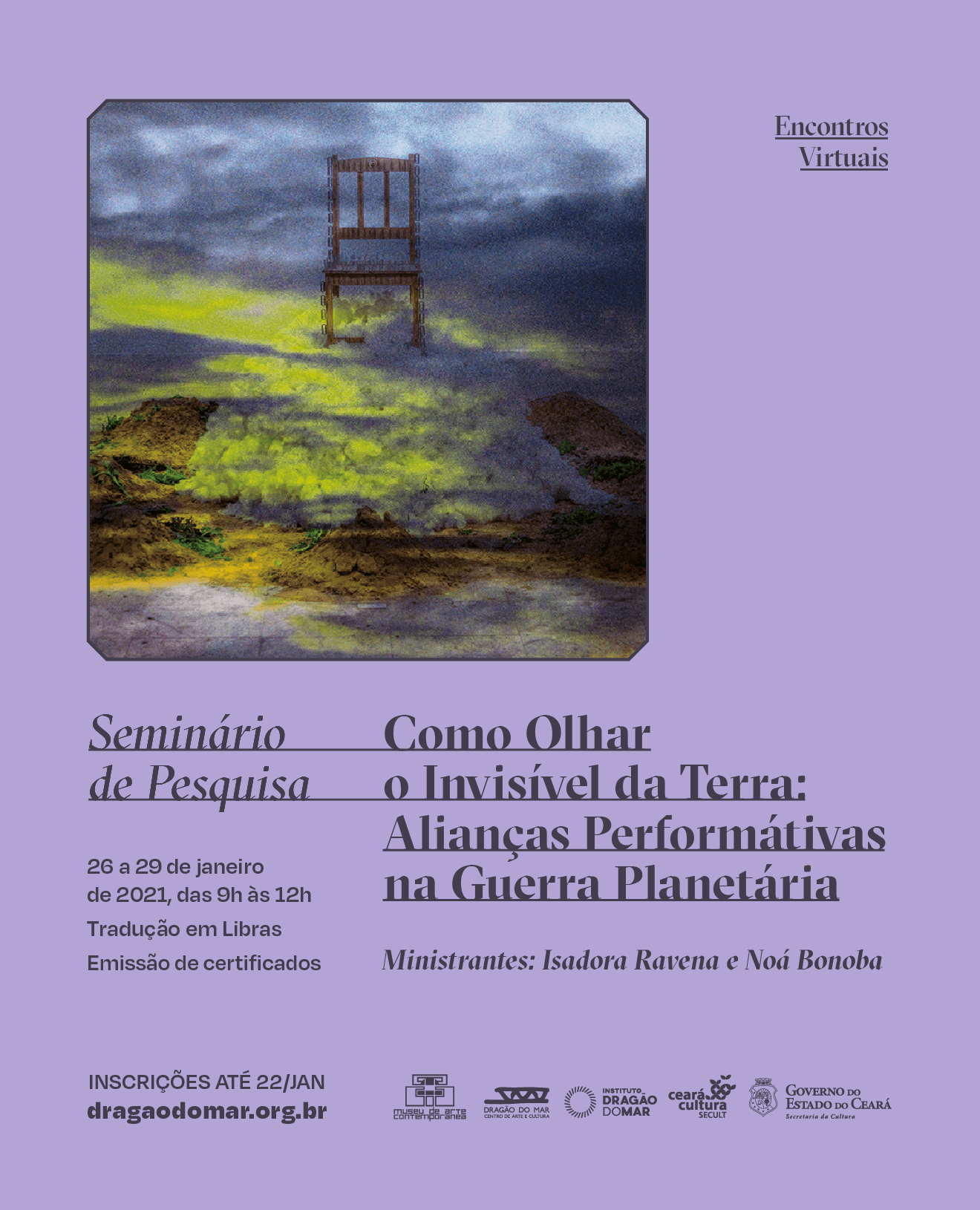 O Centro Dragão do Mar de Arte e Cultura, por meio do Museu de Arte Contemporânea do Ceará, realizará mais uma formação virtual gratuita em arte contemporânea. O Seminário de Pesquisa “Como Olhar o Invisível da Terra: Alianças Performativas na Guerra Planetária” será ministrado pelas artistas e pesquisadoras Isadora Ravena e Noá Bonoba, de 26 a 29 de janeiro de 2021, em sala fechada na plataforma Zoom. Interessados devem efetuar inscrição de 20 a 22 de janeiro no site do Dragão do Mar ou diretamente no link. Serão disponibilizadas 40 vagas. Inscritos com participação comprovada receberão certificado. Também haverá tradução em Libras caso seja indicada a necessidade no ato da inscrição.