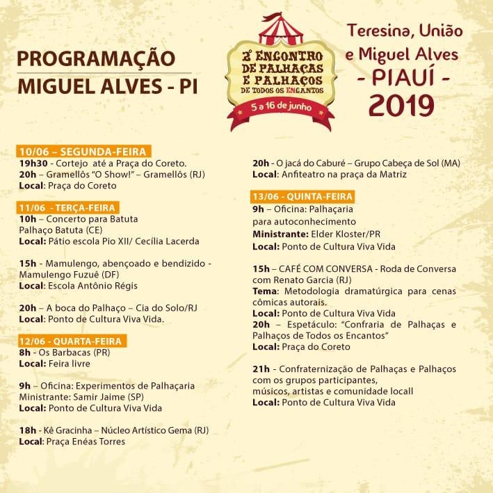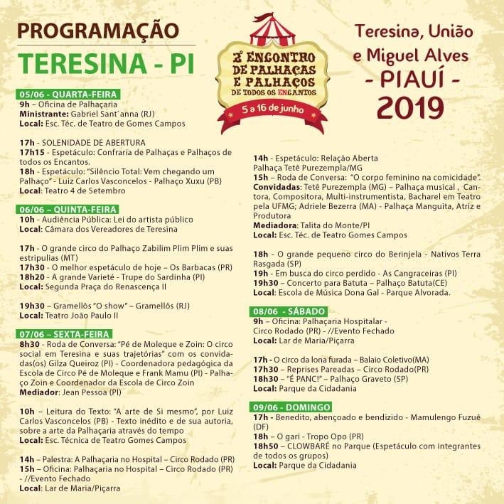 O mês de junho começa com muita alegria. De 5 a 16 acontece o 2º Encontro de Palhaças e Palhaços de Todos os Encantos. O evento irá percorrer as cidades de Teresina(de 5 a 9), Miguel Alves(de 10 a 13) e União(de 14 a 16).