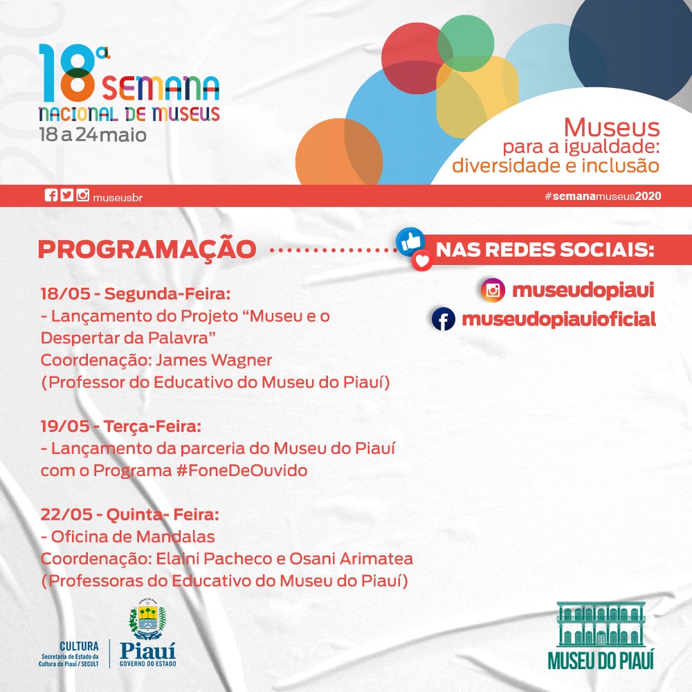 Dia 18 de maio foi comemorado o Dia do Museu. Uma data que normalmente é marcada por muitas atividades pelo Brasil, mas que este ano, ganhou uma nova forma de se festejar. No Piauí, o Museu do Piauí – Casa de Odilon Nunes, está com uma programação dentro da Semana Nacional de Museus. Pelos canais interativos a casa que guarda a história do estado, está disponibilizando uma programação para os internautas, que se encerra na próxima quinta-feira, dia 22 de maio com uma oficina de mandalas.