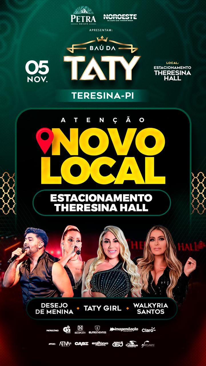 Em novembro, Teresina receberá o Baú da Taty com grandes atrações musicais. A programação contará com nomes da música nacional, como Taty Girl, Walkyria Santos e Desejo de Menina, juntos em uma noite inesquecível. Com nova estrutura, amplo espaço e localização, o evento será realizado no estacionamento do Theresina Hall.