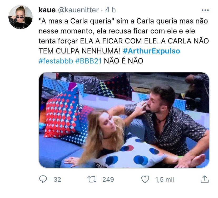 O nome do capixaba foi parar nos assuntos mais comentados do Twitter. Internautas repercutiram na rede social vídeos do momento em que a sister tenta se esquivar dos beijos insistentes de Arthur.