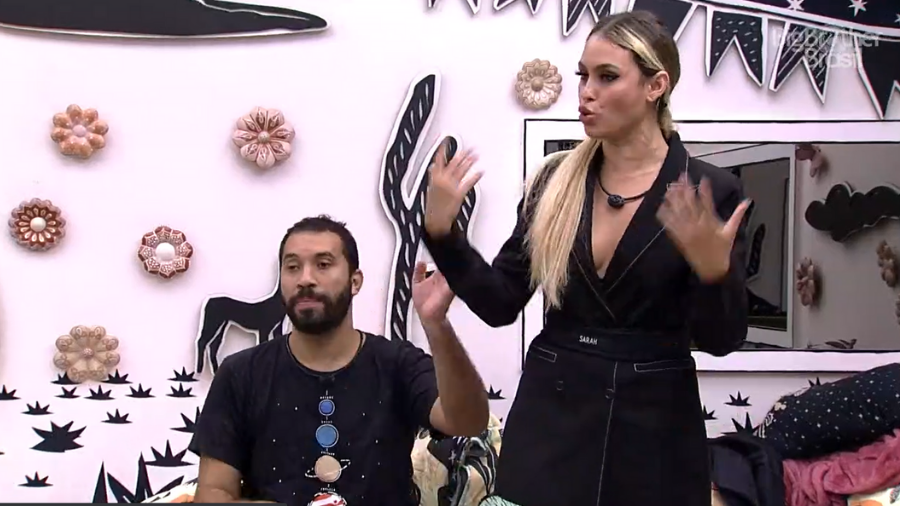 "Isso não se faz", disse Sarah. Gil continuou: "E assim, me desculpe, mas na minha opinião, eu analisei - posso estar enganado -, ela pensou: me arrombei, se eu for pro paredão, lasquei. Por enquanto eu vou me organizando aqui de novo". "Nem de brincadeira você vai botar teu amigo na reta!", reforçou Sarah. "A gente pode nem estar pensando no nome dele...", falou Gil. Sarah completou: "Mas ela fez tipo assim: vou jogar no ar, vai que pegam". O pernambucano concordou: "Exatamente!".