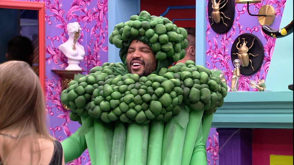 Projota e Pocah estão no Quarto Colorido do BBB21 vestindo a fantasia do Castigo do Monstro "Marmita": a cantora está de "frango" e o rapper, de "brócolis". Juliette, que acompanha os colegas de confinamento, brinca com o brother: "Projócolis!" João Luiz, que também está no cômodo, repete o apelido dado pela sister.