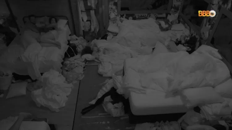 Enquanto Eliezer e Natália movimentavam o edredom, um novo casal surgiu no quarto grunge: Gustavo e Laís. O carinho entre a dupla seguiu por um tempo, até ser interrompido por Paulo André e Pedro Scooby. "Vocês querem que eu pegue o edredom, gente?", disse o surfista em tom de brincadeira. Douglas também brincou com a médica e o bacharel em direito e disse: "Tá com a língua grudada?".