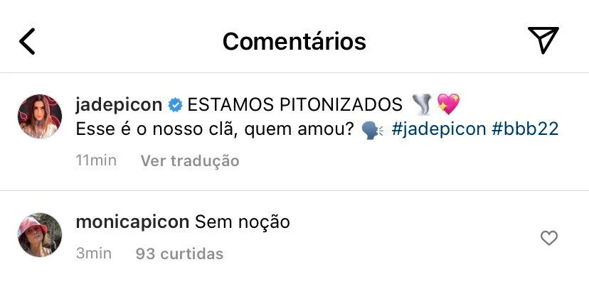 Monica Picon comentou, de forma objetiva e clara, que não está de acordo com o que foi feito no perfil da filha. “Sem noção”, escreveu ela em um dos posts que citava personagens em quem Jade poderia ter se inspirado para se comportar como vem fazendo dentro da casa. Dentro desse “clã”, como diz o vídeo publicado, foram citadas: Regina George, Medusa, Carminha, Cruella de Vil e a própria cobra Piton.