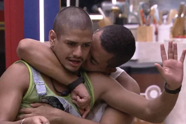 No sofá da casa, Bruno agarrou Gabriel, o prendeu com os braços e beijou o pescoço do artista, conhecido por interpretar o Mosca em "Chiquititas".