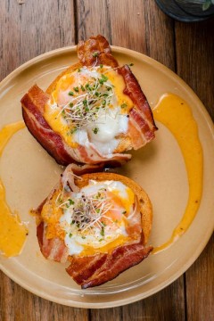 Na P.ovo (Rua Visconde de Pirajá 437, Ipanema), os ovos beneditinos (R$ 40) vêm com brioche, bacon e molho holandês.