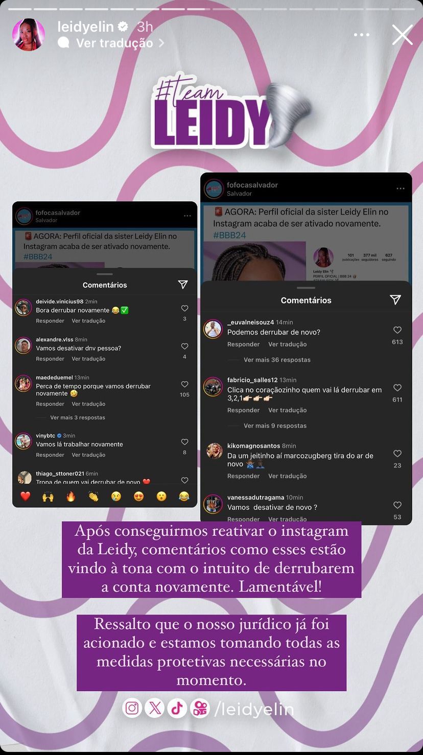 "O Instagram da Leidy foi derrubado. Depois de dias extremamente difíceis e uma corrida contra o tempo, conseguimos reativar junto com a Meta", escreveu o perfil.