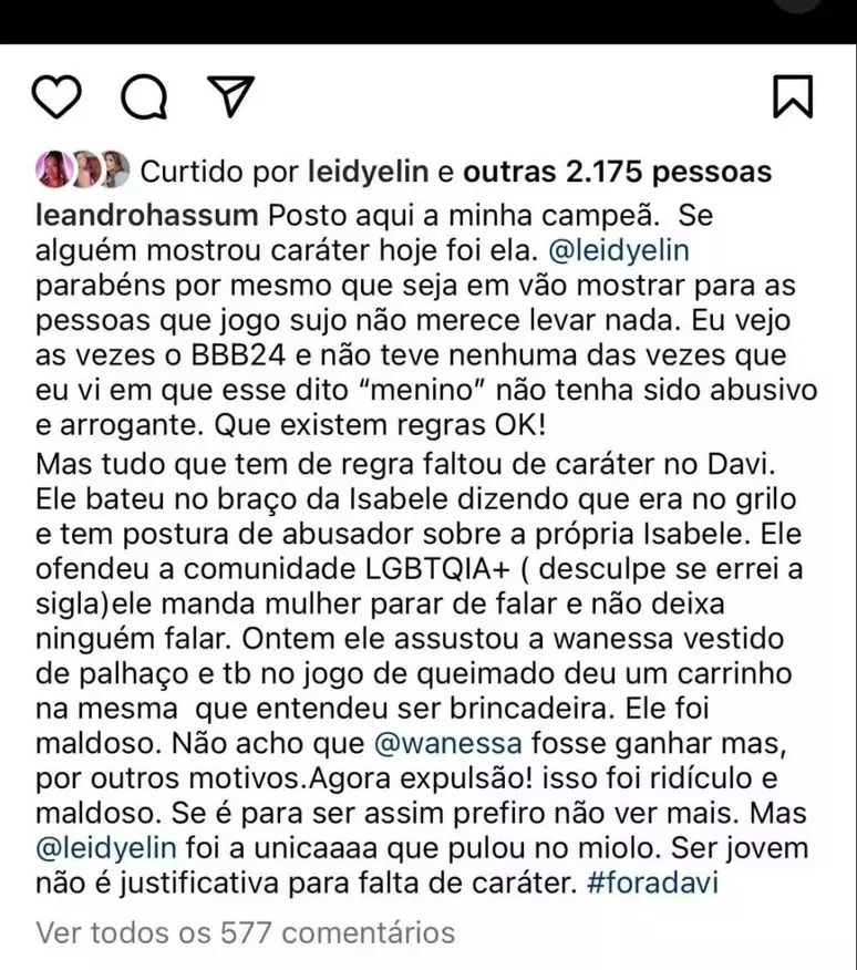 "Posto aqui a minha campeã. Se alguém mostrou caráter hoje foi ela. Leidy, parabéns por mesmo que seja em vão mostrar para as pessoas que jogo sujo não merece levar nada. Eu vejo às vezes o 'BBB 24' e não teve nenhuma das vezes que eu vi em que esse dito 'menino' não tenha sido abusivo e arrogante. Que existem regras OK! Mas tudo que tem de regra faltou de caráter no Davi", escreveu.