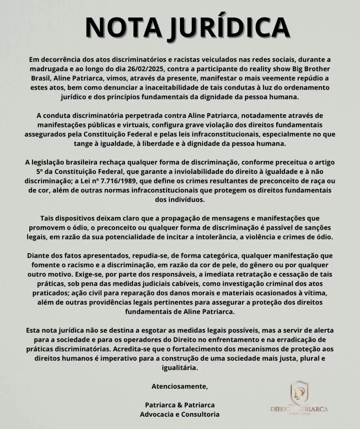 Após repercussão do exposed contra a mãe de Thiago, e uma onda de comentários odiosos dos internautas com a eliminação de Diogo, a equipe de Aline postou uma nota jurídica em repúdio à discriminação que a baiana tem sofrido nas redes. Veja a nota na íntegra.
