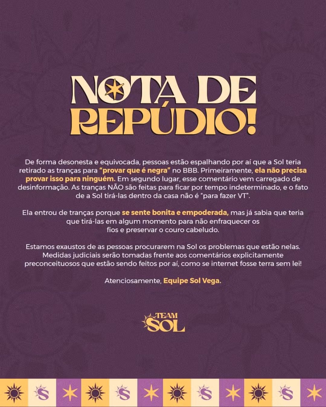 Estamos exaustos de as pessoas procurarem na Sol os problemas que estão nelas. Medidas judiciais serão tomadas frente aos comentários explicitamente preconceituosos que estão sendo feitos por aí, como se internet fosse terra sem lei", diz a nota publicada nas redes sociais.