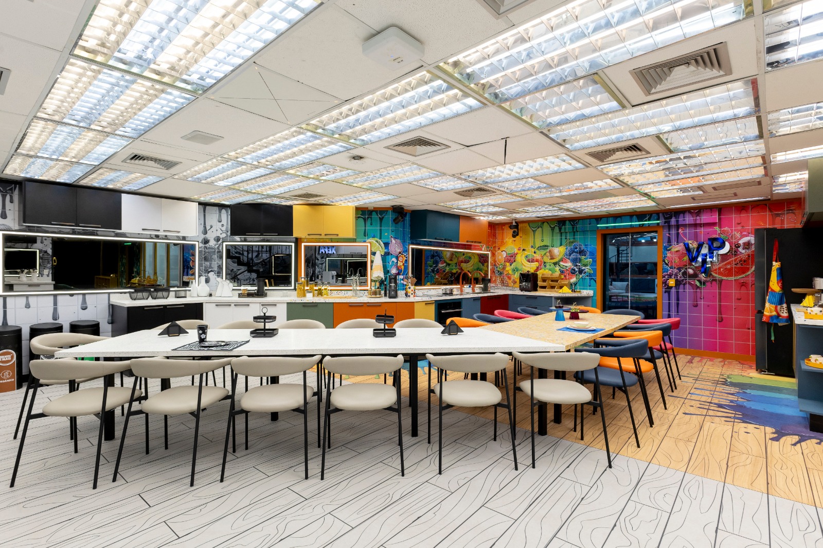 As cozinhas mantêm o contraste clássico do jogo entre fartura e escassez. O espaço VIP é colorido, com imagens de frutas, legumes e efeitos visuais vibrantes, enquanto a Xepa replica a mesma arte só que em preto e branco.