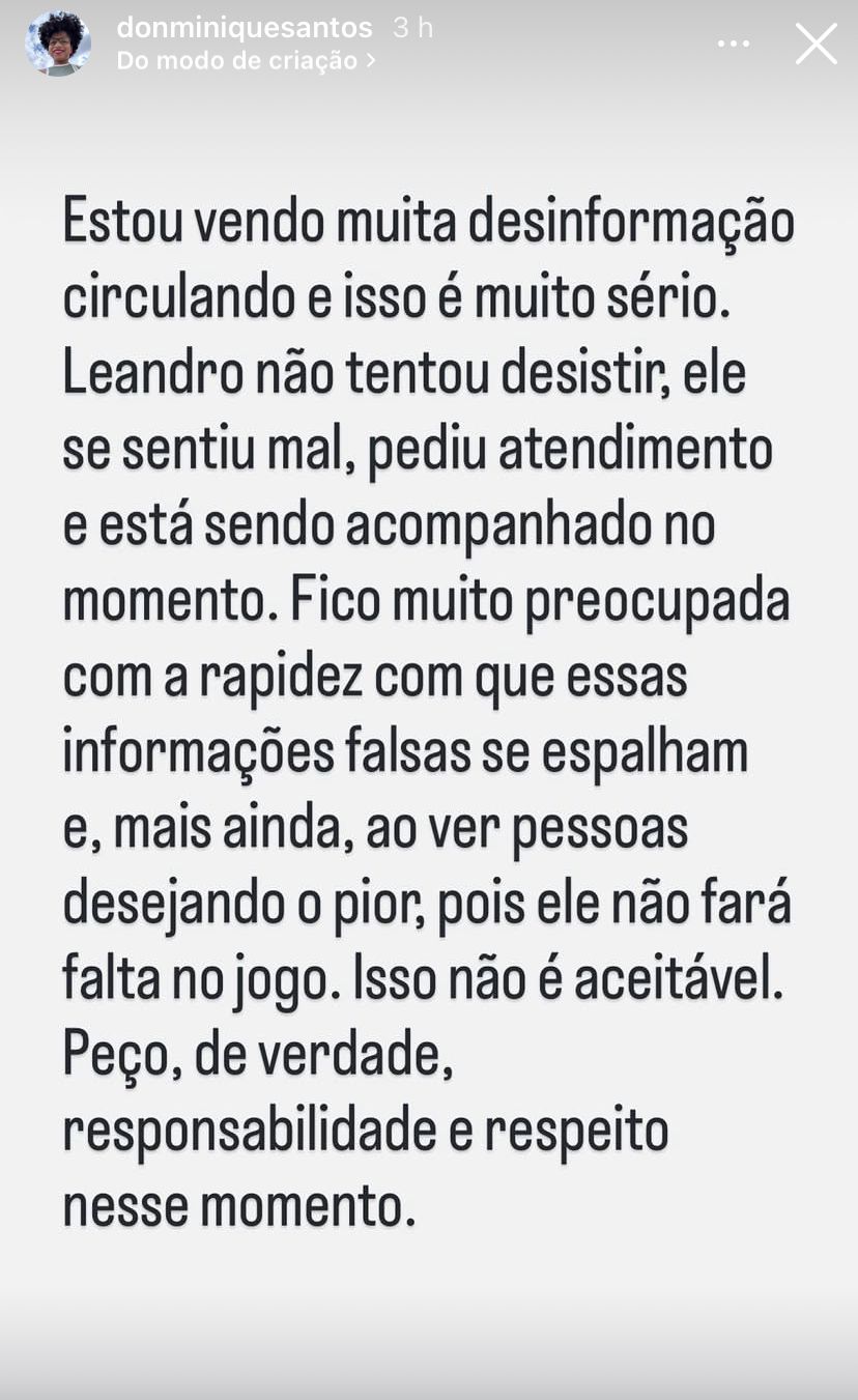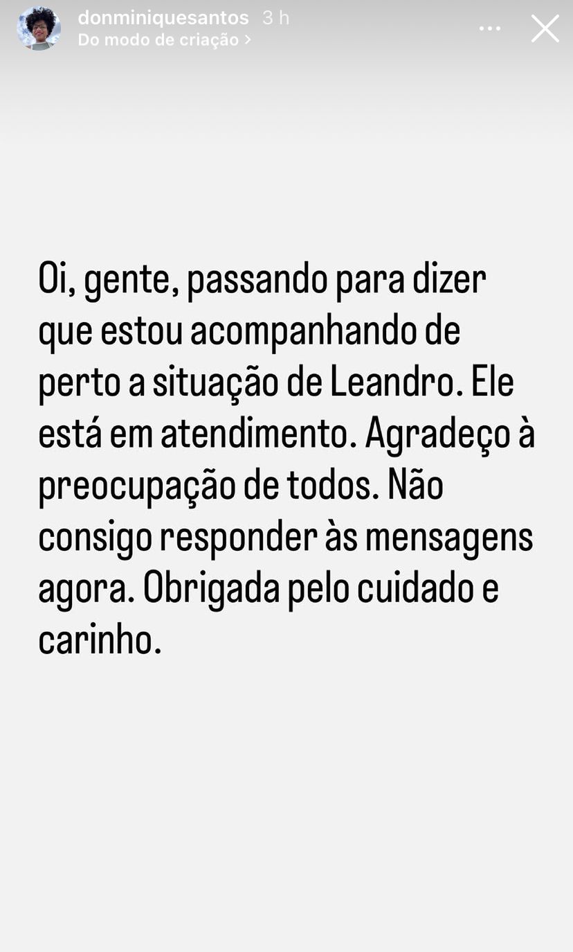 ‘’Oi, gente, passando pra dizer que estou acompanhando de perto a situação de Leandro. Ele está em atendimento. Agradeço à preocupação de todos. Não consigo responder às mensagens agora. Obrigado pelo cuidado e carinho’’, iniciou.