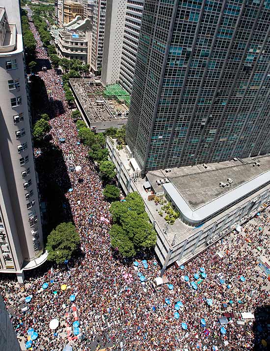 O tradicional Cordão da Bola Preta comemorou neste sábado (14) seu 97.º carnaval com uma homenagem aos 450 anos do Rio de Janeiro. Milhares de pessoas acompanharam o mais popular bloco do Rio, que já alcançou público de 2 milhões de pessoas em outros carnavais, e neste ano, em um novo cenário, tem a estimativa de repetir o número. Com a interdição da Avenida Rio Branco para obras, o desfile foi transferido para a Avenida Antônio Carlos, também no centro da capital carioca.
