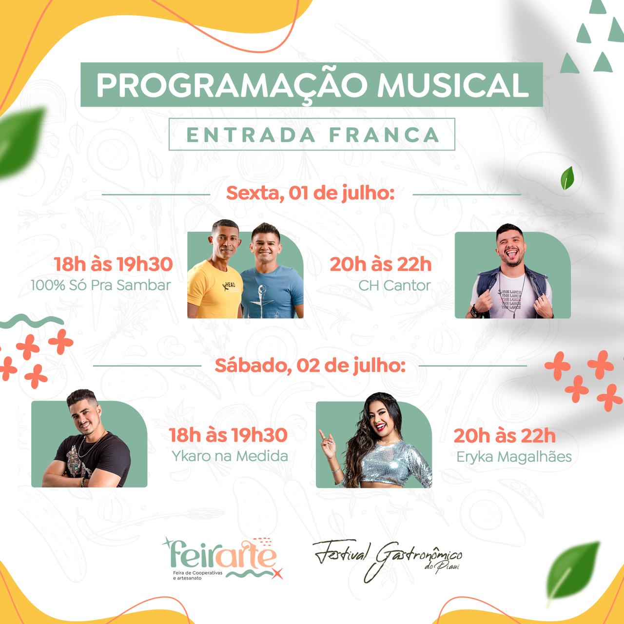 No dia 2 de julho, o Centro de Convenções de Teresina recebe o segundo dia da Feira de Artesanato e o do Festival Gastronômico. Prosseguindo com as exposições e amostras dos produtores locais, o público poderá conferir mais uma vez o que de melhor tem no estado no âmbito da gastronomia e artesanato. Como no primeiro dia, o evento tem início às 18h. Já as atrações musicais serão “Ykaro Na Medida” e “Eryka Magalhães”.