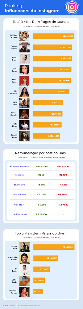 Ao levar em conta somente os brasileiros, o Neymar está em primeira colocação cobrando em média R$4.120.000 por post no Instagram. O Ronaldinho Gaúcho está na segundo posição, com um faturamento de R$1.505.000 por post. O ator Caio Castro recebe em média R$750.000 por post, e está na terceira posição. E por fim a Camila Coelho e Gracyanne Barbosa, cobram em média R$150.000 e R$120.000 por post, respectivamente. (Fonte: Statista, CupomValido.com.br, Hopper)