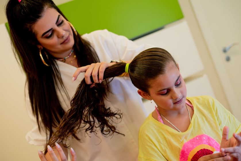 Nem só do look é feita a fantasia. As madeixas merecem uma atenção especial, principalmente das crianças. A dermatologista faz muitos penteados no cabelo de Maria, a pedido da menina, sobretudo nos dias de aulas escolares.