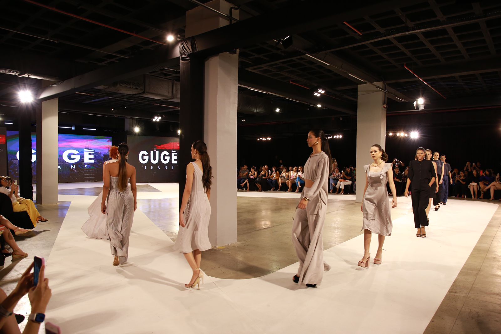 Uma das surpresas da coleção foi o drama dos conjuntos all back e all jeans fluídos, uma total homenagem ao tema do PMH deste ano, o movimento. O all black, atemporal, e o all jeans, que apresentou uma mescla entre o casual e o elegante, foram o extrato da versatilidade das peças da Gugê.