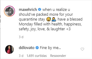 Apesar de as equipes de ambos não terem se manifestado sobre o caso, as interações de Demi e Max pelas redes sociais deixaram os fãs da artista desconfiados. Nesta terça (24), o ator postou uma foto sem camisa, em que dizia na legenda: “Quando você percebe que deveria ter colocado mais coisas na mala para sua estadia de quarentena”. Pouco depois, a voz de “Stone Cold” respondeu ao post: “Está ótimo para mim”. Sugestivo… Olha só: