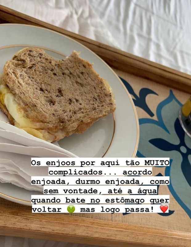 "Os enjoos por aqui estão muito complicados. Acordo enjoada, durmo enjoada, como sem vontade, até a água quando bate no estômago quer voltar. Mas logo passa", detalhou ela.