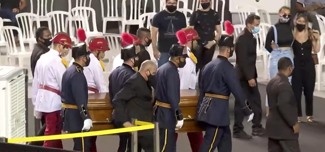 Alguns passam deixando rosas brancas ao lado do caixão e acenam para familiares e amigos, prestando homenagem.