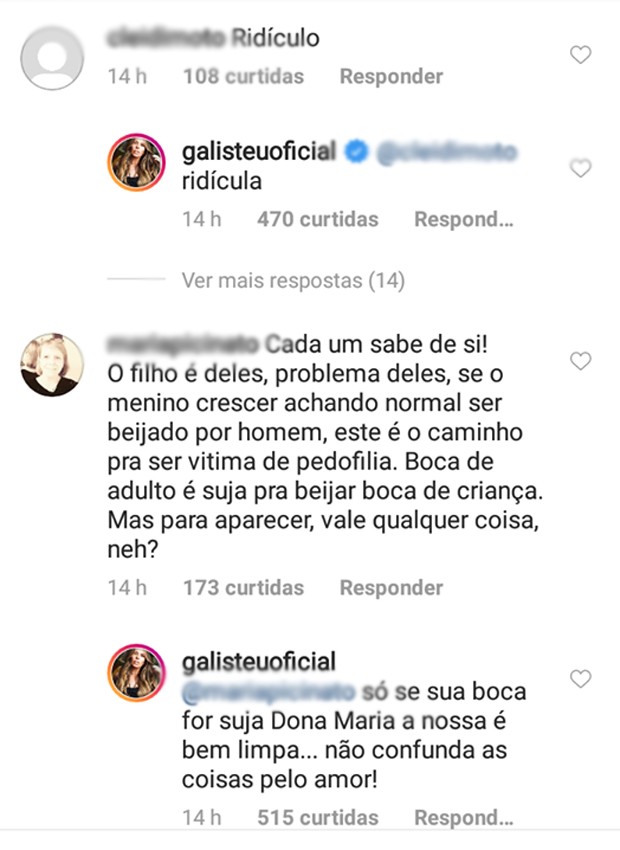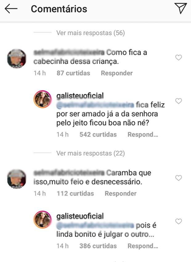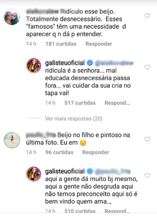 Galisteu também comentou o fato de ter decidido responder aos comentáros críticos. "Poucas vezes na vida, pouissímas, eu respondo as pessoas. Desta vez, decidi responder um por um. Quis responder um por um e ser tão louca como as pessoas foram comigo [ao escrever mensagens]. Não é o jeito o que estou habituada, mas respondi. As minhas respostas são super fora do que costumo falar e fazer. Tem que ter humor, sou dessas. Deixo as pessoas criticarem, não bloqueio... Desta vez, bloqueei umas duas pessoas que pegaram pesado. Conto com o amor das pessoas e não com esse julgamento tosco, grosseiro."