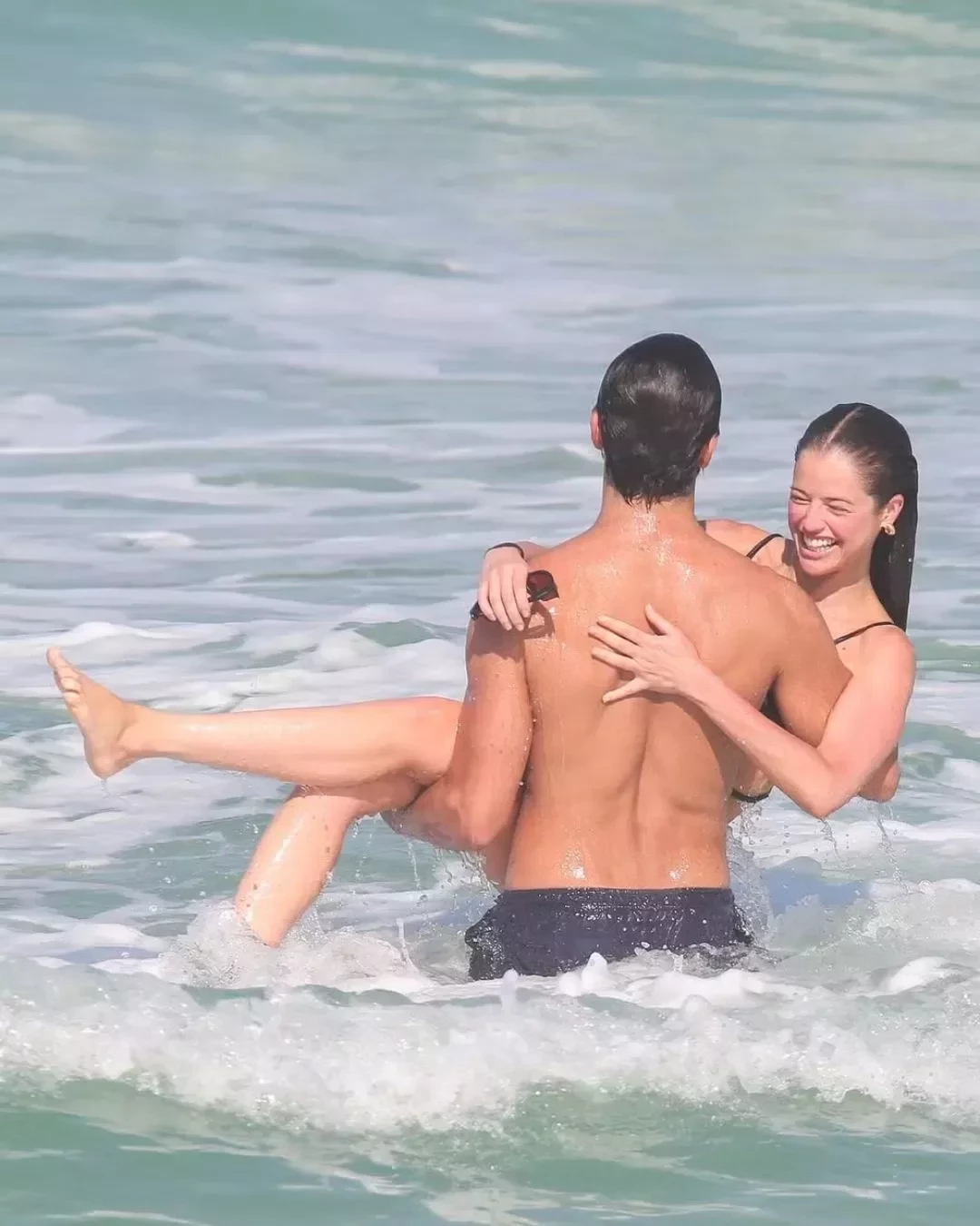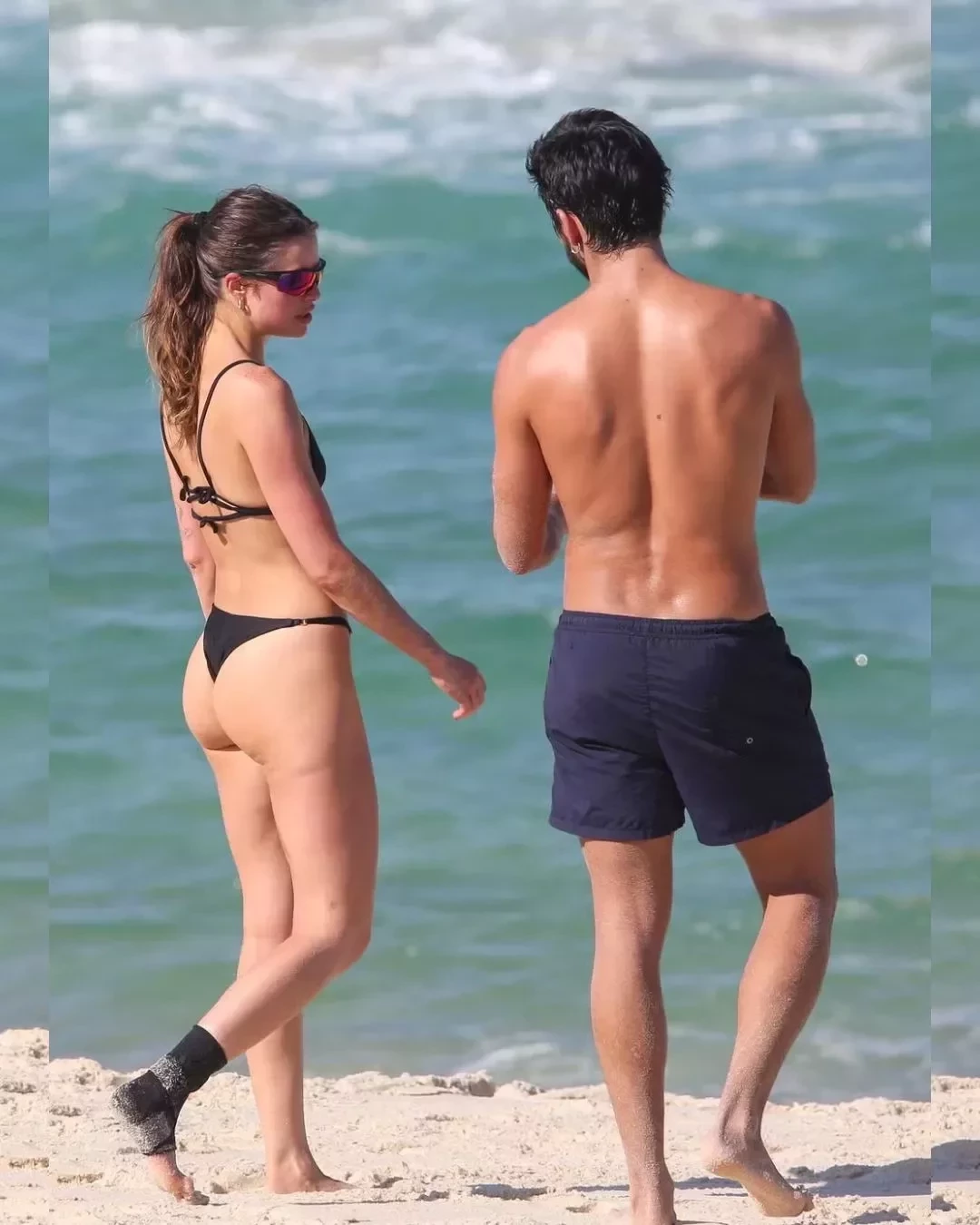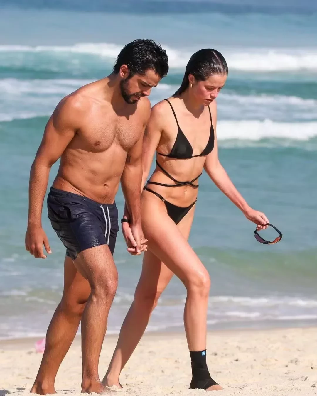 A atriz usava um biquíni preto, com um detalhe trançado na região da barriga, com um short curto como saída de praia, enquanto o ator, que se encerrou sua participação em Renascer e curte dias de descanso, usou apenas uma bermuda preta.
