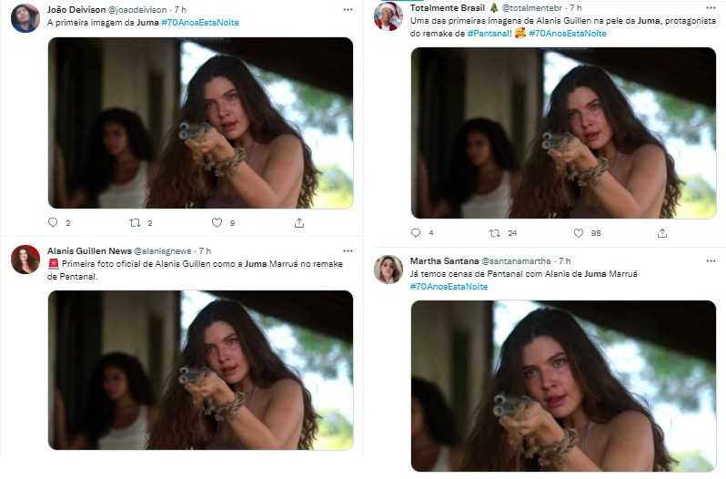 Alanis Guillen, 23 anos de idade, apareceu caracterizada como Juma Marruá, protagonista de Pantanal, no especial 70 anos esta noite, exibido pela TV Globo na terça-feira (21). A atração foi exibida em comemoração aos 70 anos de novelas no Brasil. Nesta semana, a atriz havia divulgado uma foto em um intervalo de gravação ao lado da amiga Julia Dalavia, que viverá a personagem Guta. As informações são da Revista Quem News.
