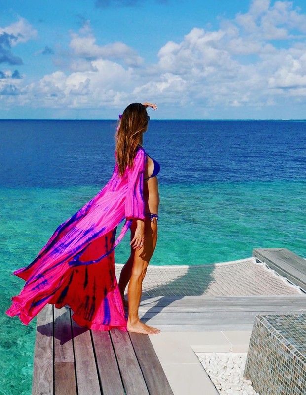 Alessandra Ambrosio publicou fotos na quinta-feira (27) no Instagram nas Ilhas Maldivas. Nas imagens, a modelo de 39 anos de idade aparece usando um biquíni azul e uma saída de praia na mesma cor com detalhes em rosa.