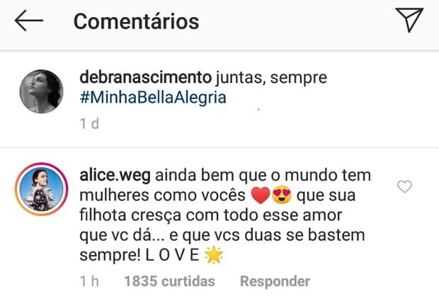 "Juntas, sempre #MinhaBellaAlegria", escreveu Débora, sem Loreto no clique. Alice, recentemente vista em Onde Nascem os Fortes, comentou: "Ainda bem que o mundo tem mulheres como você! Que sua filhota cresça com todo esse amor que você dá...e que vocês duas se bastem, sempre! Love!".