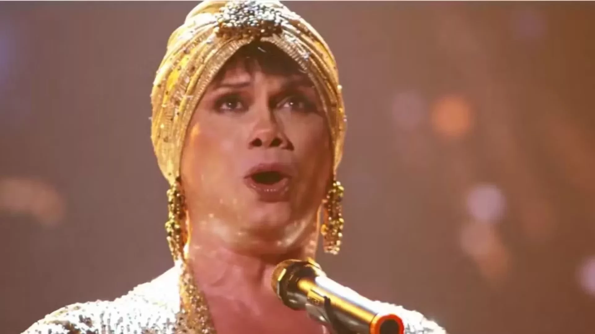 Vestindo um vestido dourado e segurando até uma toalhinha, Silvero imitou os gestos característicos da diva e se emocionou enquanto dublava "I Will Always Love You", da trilha sonora do filme 'O Guarda-Costas' (1993).