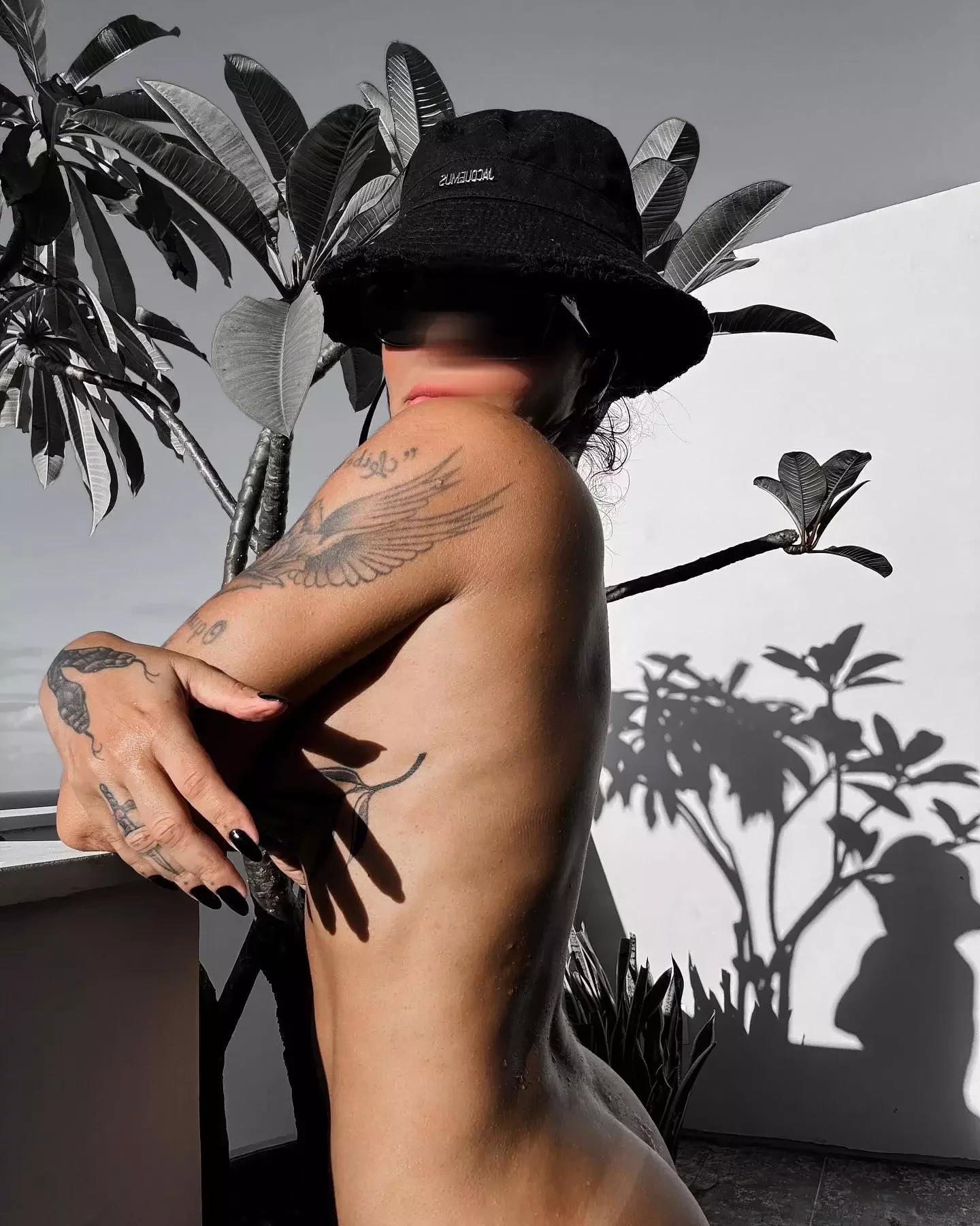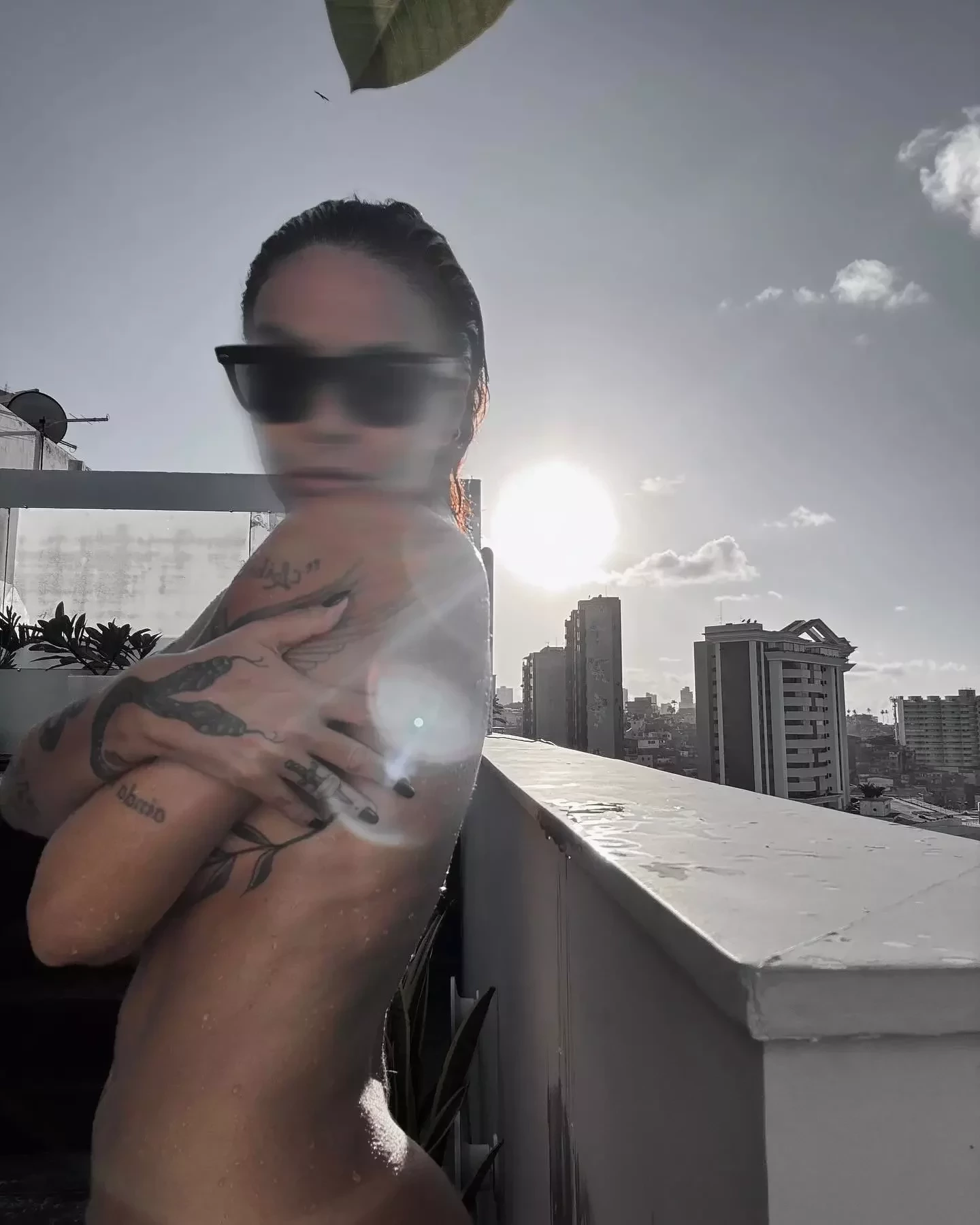 Nas imagens, a ex-vocalista da banda Cheiro de Amor exibiu as tatuagens que tem pelo corpo e a marquinha de sol enquanto aproveitava a água da piscina e também uma ducha. Recentemente, ela realizou uma Lipo LAD (lipoaspiração de alta definição) e até mostrou o antes e depois para seus admiradores.