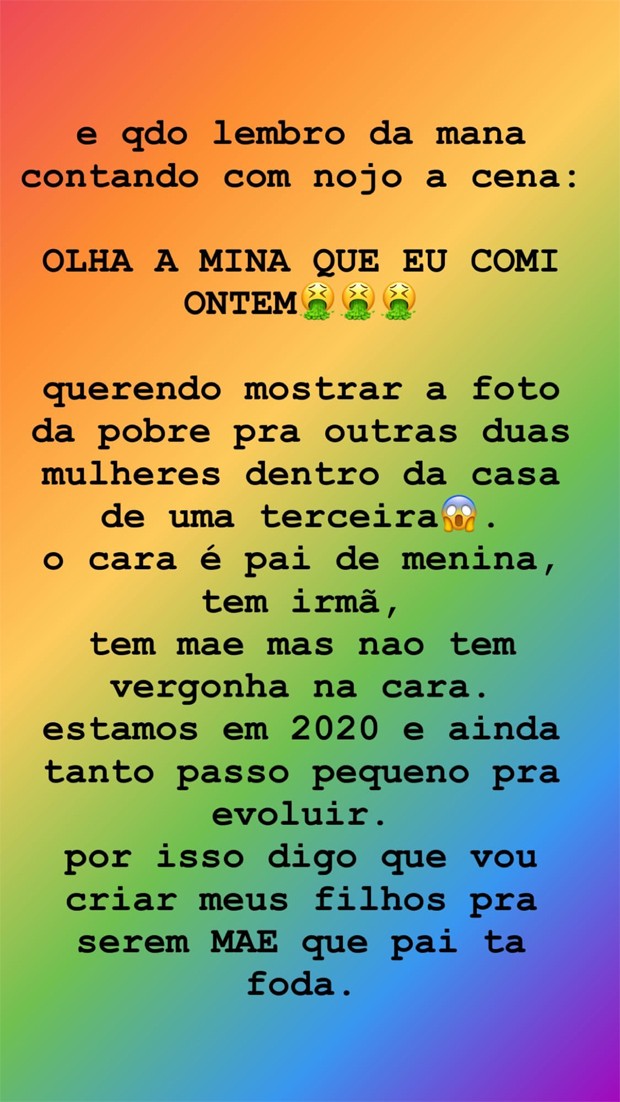 A apresentadora ainda relembrou de um relato de uma mãe: "E quando lembro da mana contando com nojo a cena: 'Olha a mina que comi ontem', querendo mostrar a foto da pobre para outras duas mulheres dentro da casa de uma terceira. O cara é pai da menina, tem irmã, tem mãe, mas não tem vergonha na cara. Estamos em 2020 e ainda tanto passo pequeno para evoluir. Por isso, digo que vou criar os meus filhos para serem MÃE, porque pai está f***", finalizou.